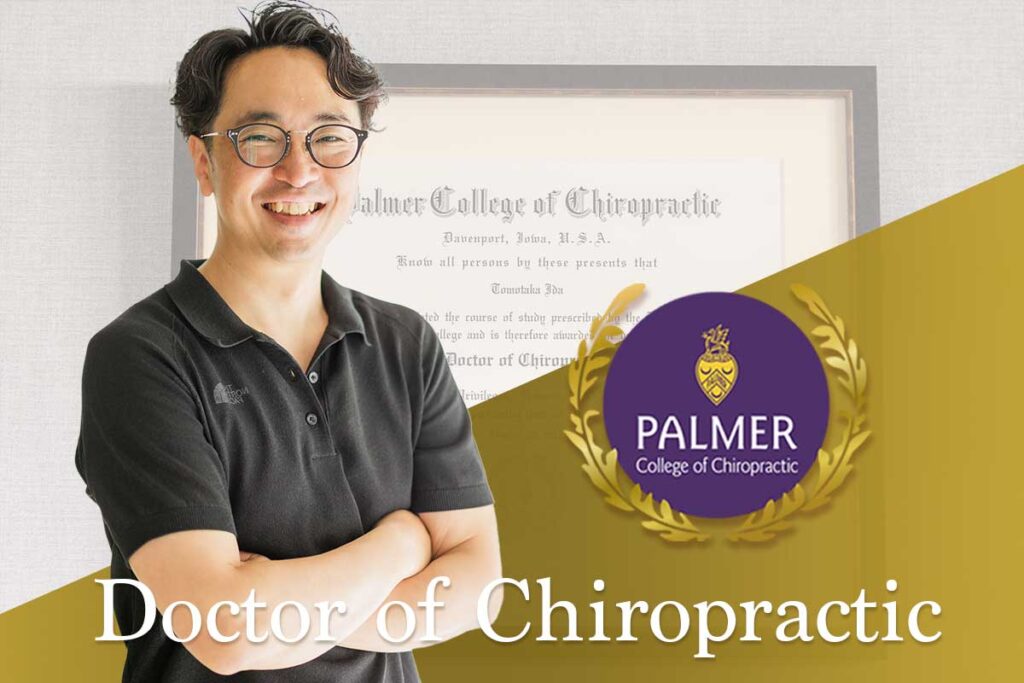ドクターによる施術「Doctor of Chiropractic(D.C.)は、米国のカイロプラクティック大学で約7年の医療教育を修了した者に授与される称号で、日本には約100人しかいない高度な技術を持つ専門家です。